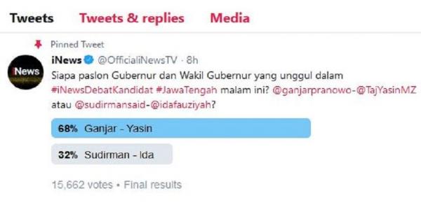Hasil jajak pendapat lewat akun Twitter iNews (@OfficialiNewsTV) sejak debat terbuka digelar dan berakhir, pasangan Ganjar Pranowo-Gus Yasin meraih dukungan dari netizen sebesar 68 persen. Sementara Sudirman Said dan Ida Fauziyah hanya memperoleh 32 persen. Ini merupakan respons netizen terhadap pertanyaan yang diajukan dalam jajak pendapat tersebut, Siapa paslon gubernur dan wakil gubernur yang unggul dalam Debat Kandidat Pilgub Jateng malam ini?