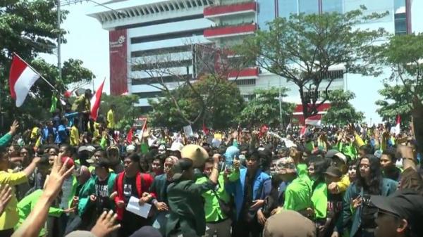 SEMARANG, iNews.id – Ribuan mahasiswa gabungan se-Jawa Tengah menggelar aksi demo di depan Kantor Gubernur dan DPRD Provinsi Jateng, Selasa (24/9/2019). Massa meminta pemerintah menolak revisi Undang-Undang (RUU) Komisi Pemberantasan Korupsi (KPK) dan Rancangan Kitab Undang-Undang Hukum Pidana (RKUHP).