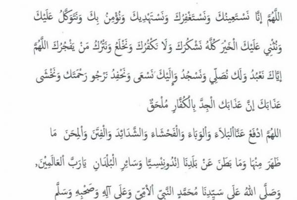 Allaahumma inna nasta‘iinuka wa nastaghfiruka, wa nastahdiika wa nu’minu bik wa natawakkalu 'alaik, wa nutsnii alaikal khaira kullahu nasykuruka wa laa nakfuruk, wa nakhla‘u wa natruku man yafjuruk. Allaahumma iyyaaka na‘budu, wa laka nushallii wa nasjud, wa ilaika nas‘aa wa nahfid, narjuu rahmataka wa nakhsyaa adzaabak, inna adzaabakal jidda bil kuffaari mulhaq.