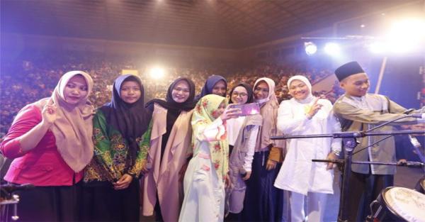 Cawagub Jateng nomor urut 2 Ida Fauziyah pose bersama voklais Sabyan Gambus, Nissa Sabyan dan penggemarnya di GOR Bahureksa, Kendal. (Foto: iNews.id)