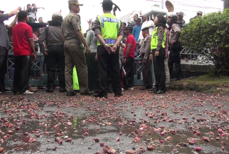 Aksi blokade tersebut kemudian dibubarkan paksa ratusan petugas Polres Brebes yang mengamankan jalannya unjuk rasa. Namun, upaya itu mendapat perlawanan dari massa hingga sempat terjadi bentrok antara petugas dengan pengunjuk rasa. Akibat blokade tersebut, jalur pantura Brebes mengalami kemacetan panjang hingga tiga kilometer.Aksi blokade jalur pantura itu baru berakhir setelah polisi bernegosiasi dengan para petani. Ratusan petani yang tak puas kemudian melempari polisi dan Satpol PP yang berjaga di pintu masuk kantor Bupati Brebes dengan bawang merah.Petani melemparkan bawang merah ke petugas Satpol PP yang berjaga di Kantor Bupati Brebes, Jateng saat demo memprotes anjloknya harga bawang.(Foto: iNews.id/Yunibar)