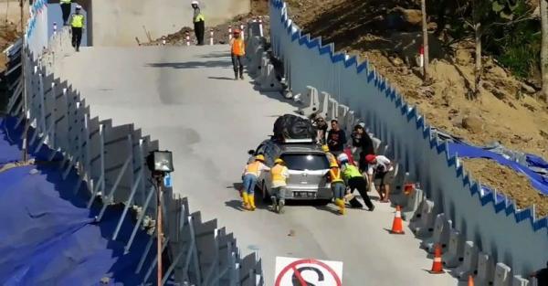 Hanya berselang beberapa menit setelah pembuktian yang dilakukan Kakorlantas dengan mengayuh sepeda, ternyata masih ada sejumlah kendaraan yang tidak kuat menanjak. Sejumlah petugas kepolisian dan pekerja kontraktor yang disiagakan langsung membantu mendorong dan menahan mobil yang telah mundur tersebut hingga akhirnya berhasil mencapai puncak tanjakan.