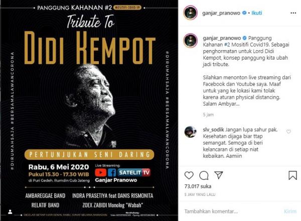 "Silahkan menonton live streaming dari Facebook dan Youtube saya. Maaf untuk yang ke lokasi kami tolak karena aturan physical distancing. Salam Ambyar," ucap Ganjar dalam akun Instagramnya.