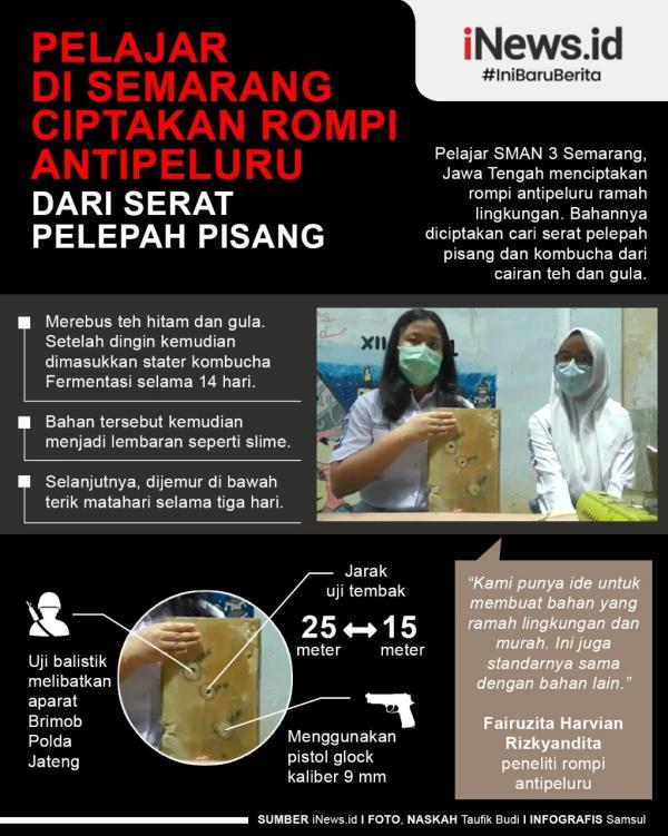 SEMARANG, iNews.id - Pelajar SMAN 3 Semarang, Jawa Tengah menciptakan rompi antipeluru ramah lingkungan. Bahannya diciptakan cari serat pelepah pisang dan kombucha dari cairan teh dan gula. Rompi antipeluru ini bisa menjadi perlengkapan wajib bagi aparat keamanan seperti pasukan polisi maupun TNI.