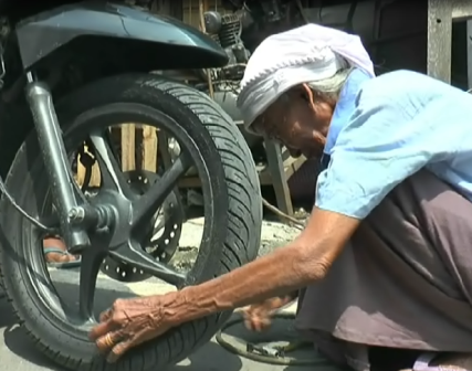Ya, di usia senjanya nenek berusia 75 tahun asal Kota Semarang, Jawa Tengah ini tetap bekerja keras mencari nafkah meski harus jadi penambal ban.Pekerjaan menambal ban memang bukan pekerjaan akrab bagi kaum hawa, terlebih dilakukan seorang nenek. Pekerjaan itu sudah digeluti Sudarmi sejak tiga tahun lalu setelah suaminya meninggal dunia.Sudarmi menuturkan, keahlian menambal ban diperoleh dari mendiang suaminya yang sejak 35 tahun lalu membuka kios tambal ban. Saat itu, Sudarmi hanya membantu meringankan pekerjaan suami, namun sejak sang suami meninggal dunia tiga tahun lalu, dia harus berjuang seorang diri menjadi penambal ban untuk dirinya dan keluarga. “Wis ora nduwe opo-opo, sing dinggo mangan yo ora ono (saya sudah tidak punya apa-apa yang buat makan juga tidak ada). Bapak dulu bilang kalau pangan kurang ya nambali ban,” tutur Sudarmi yang membuka jasa tambal ban di pinggir jalan kawasan Stadion Diponegoro Kota Semarang, Minggu (31/12/2017).