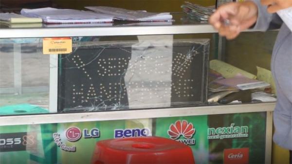 Kaca etalase konter HP MJ Cell di Jalan Tambak Dalam Raya Semarang berlubang akibat ditembaki orang tak dikenal, Senin (7/1/2019). (Foto: iNews.id/Donny Marendra)