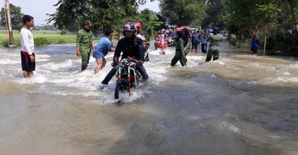 Petugas Linmas Kecamatan Jatibarang membantu mengarahkan pengguna jalan yang terjebak banjir di rua jalur alternatif Brebes-Purwokerto. (Foto: Facebook)
