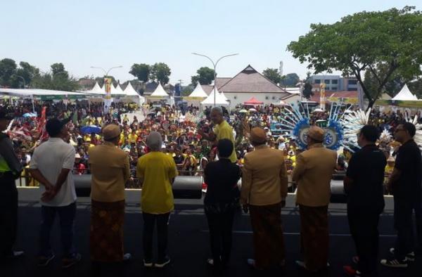 "Adira terima kasih, iNews terima kasih sudah menggelar acara Festival Pesona Lokal. Betapa indahnya, bahagianya bisa merawat budaya. Inilah ekonomi kreatif sebagai tonggak ekonomi baru. Terus kreatif dan inovatif," kata Ganjar Pranowo di panggung utama De Tjolomadoe, Karanganyar, Jateng, Minggu (9/9/2018).