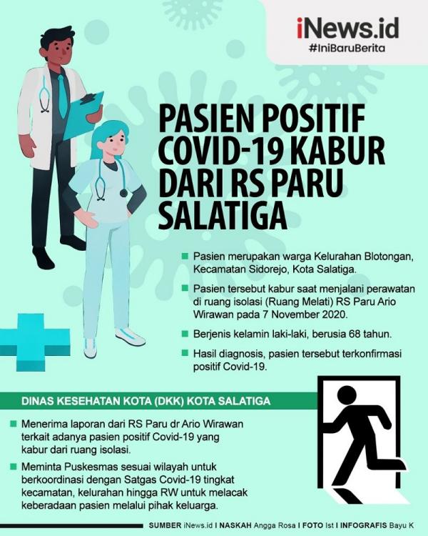 SALATIGA, iNews.id – Seorang pasien positif Covid-19 yang dirawat di Rumah Sakit (RS) Paru Ario Wirawan Salatiga, melarikan diri. Pasien berinisial A merupakan warga Kelurahan Blotongan, Kecamatan Sidorejo, Kota Salatiga. Pasien tersebut kabur saat menjalani perawatan di ruang isolasi (Ruang Melati) RS Paru Ario Wirawan pada 7 November 2020.