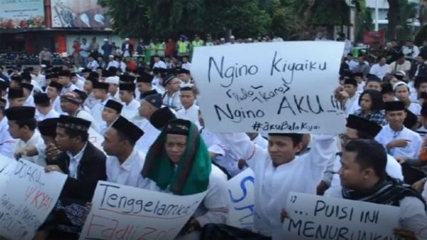 KUDUS, iNews.id - Ribuan santri yang tergabung dalam Aliansi Santri Bersama Kiai (Asmak) menggelar aksi bela kiai di Alun-Alun Simpang Tujuh Kudus, Jawa Tengah, Jumat (8/2/2019).
