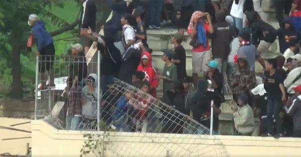 Aksi saling lempar semakin memanas. Sejumlah pendukung Persis Solo mulai merusak pagar pembatas tribun timur stadion. Polisi yang mencoba menghalau aksi tawuran ini tidak bisa berbuat banyak. Akibat kejadian itu, pertandingan sempat dihentikan saat Persis Solo memimpin 1-0 di babak pertama.