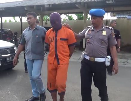 Kedes Jatiluhur, Kebumen, Jateng, Ponco Sujatmiko, dikeler petugas menuju ruang tahanan Polres Kebumen. (Foto: iNews.id/Joe Hartoyo)