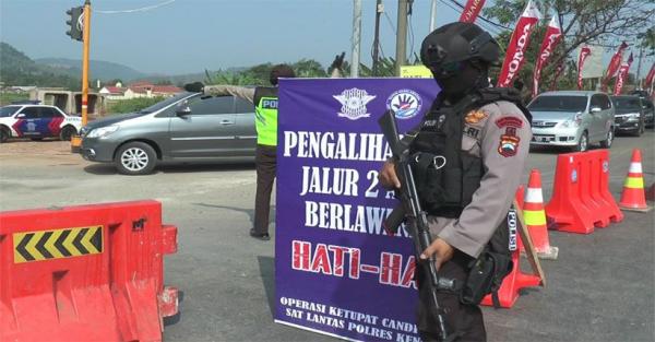 Anggota Brimob Polda Jateng bersenjata laras panjang mengawal perjalana pemudik di tol fungsional Batang-Semarang, Kendal. (Foto: iNews.id/Eddie Paryitno)Sahrul mengaku tidak menemui kendala maupun kemacetan berarti selama menempuh perjalanan di tol fungsional itu. Dia hanya terjebak antrean saat di pintu keluar Flyover Gringsing. Sebab, kendaraan harus antre panjang untuk bisa kembali ke tol fungsional Batang-Semarang melalui pintu Tol Weleri. “Semuanya relatif aman-aman saja. Rambu-rambu juga sudah cukup banyak,” katanya.