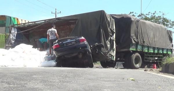 “Mobil sedan itu posisinya sudah berhenti, karena ada dump truk yang hendak memutar arah. Saat truk yang melawan arah berada di tengah jalan, truk gandeng mencoba menghindar hingga terguling,” kata Sapto, saksi mata.